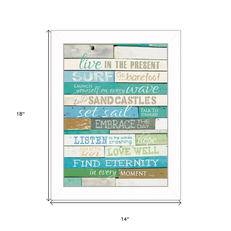 Bring some sizzle to your space with this eye-catching live in the present 5 white framed print wall art. This print is a visual artistic expression that allows you to decorate your space in style. Reproduced for you on paper, this hanging decorative accent will be a trendy and fashionable way to dress your walls. Hang on your wall to add some up to date fashion and decoration. Instantly liven up your space with this art that brings color and dimension to your walls. 18-inch H x 14-inch W x 1-inch DIngredients: Size: Color: Made In: United States
