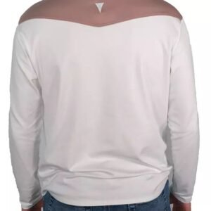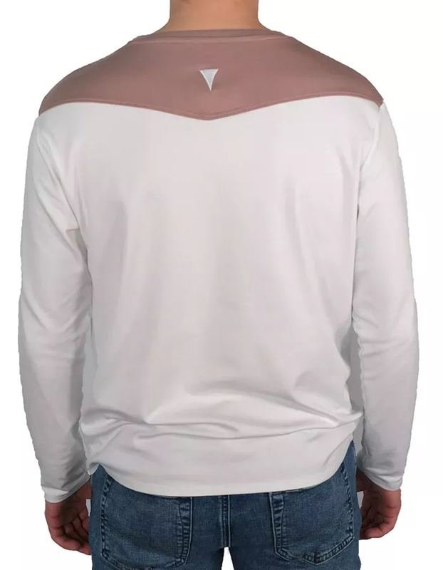 Step-up your day or evening style in this super soft, breathable long sleeve crewneck shirt in white with a mauve color block shoulder panel. This casual shirt is amazingly comfortable with a slight stretch, comes out of the dryer wrinkle-free, and can be worn year-round!