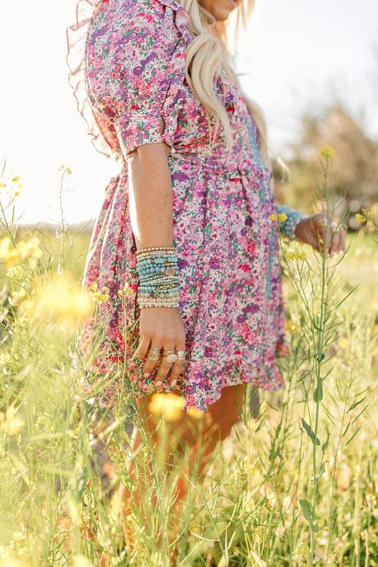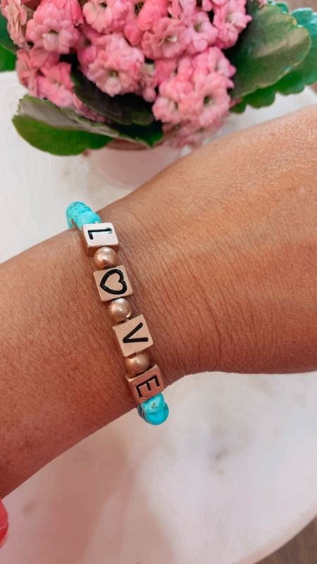A stretch bracelet with semi-precious turquoise stone beads and gold square beads spelling out “Love”.
