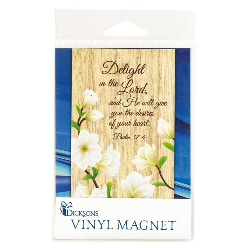 Floral vinyl magnet displays the words Delight in the Lord, and He will give you the desires of your heart, the Bible verse Psalm 37:4.