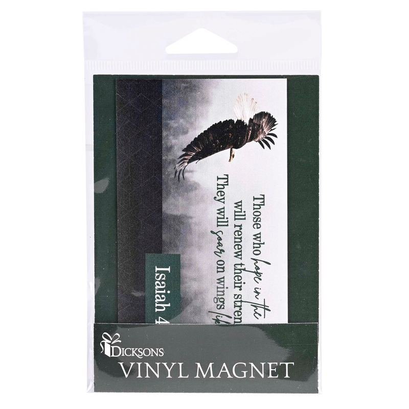 Multi-Color Vinyl Magnet Features Soaring Eagle Artwork And Isaiah 40:31: Those Who Hope In The Lord Will Renew Their Strength. They Will Soar On Wings Like Eagles. Size Is 5 W x 2 3/4 H. Comes In A Clear Header Bag.