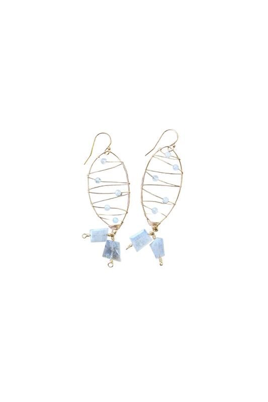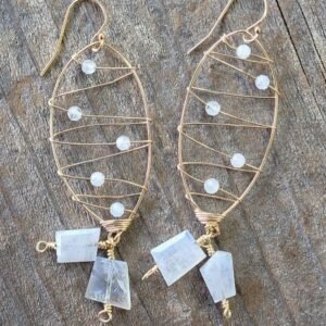 Gold dangle earrings in the shape of a dolphin tail with moonstone accent stones.