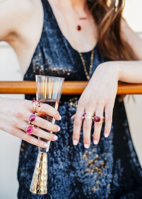 Each ring will have ruby Swarovski crystals. Additionally, gold-toned rings will have a rose gold stardust bead, while the silver-toned rings will have a silver stardust bead.