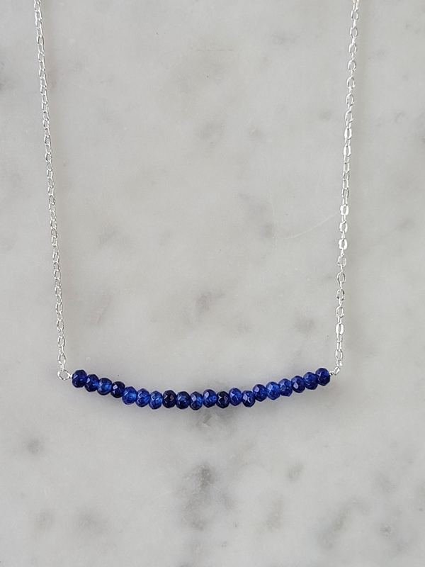 A gold or silver colored brass strung with petite semi-precious sapphire stones. The perfect necklace to be worn individually or layered.