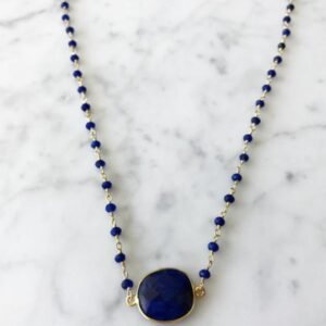 A semi-precious sapphire stone set in a 14k gold fill bezel sitting on a semi-precious sapphire beaded gold chain with a 14k gold fill clasp.