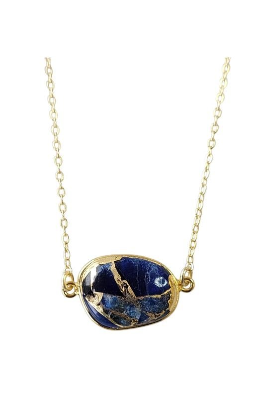 A semi-precious blue mojave copper turquoise stone set in a 14k gold fill bezel sitting on a gold or silver colored brass chain.