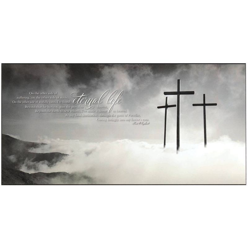 A heavenly cloudscape with mountains and three crosses combine to create the perfect setting for the poem On the Other Side, on this large wall plaque.
