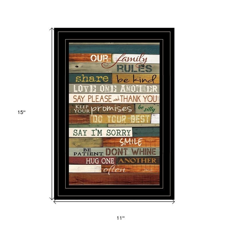 This our family rules 4 black framed print wall art will add a beautiful decorative accent to your decor. This print is a visual artistic expression that allows you to decorate your space in style. Reproduced for you on paper, this hanging decorative accent will be a trendy and fashionable way to dress your walls. Hang on your wall to add some up to date fashion and decoration. Utilize this opportunity to create a focal point in the room with this fabulous wall decor option. 15-inch H x 11-inch W x 1-inch DIngredients: Size: Color: Made In: United States