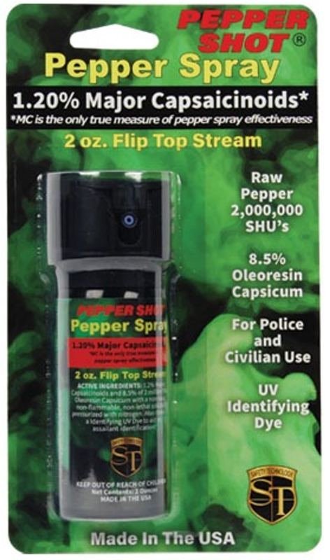 Pepper Shot 1.2% MC 2 oz pepper spray stream flip top stream. Pepper Shot Pepper Spray is made with 1.2% Major Capsaicinoids. The Major Capsaicinoids are the true heat measure and Pepper Shot 1.2% MC is more effective than of most other pepper sprays. In addition to causing an attacker pain, The Pepper Shot 8.5% oleoresin capsicum formula swells the mucous membranes, which makes breathing difficult, and swells the veins in the eyes, causing the eyes to close. It’s made from 2,000,000 SHU’s of raw pepper and these effects can last up to 45 minutes and cause no permanent damage. Has a UV identifying dye to help aid in the identification of an attacker. Flip top Actuator Pepper Spray Stream 6-10 one second burst & range of 8-10 ft. 4 1/8 ” x 1 3/8 ”