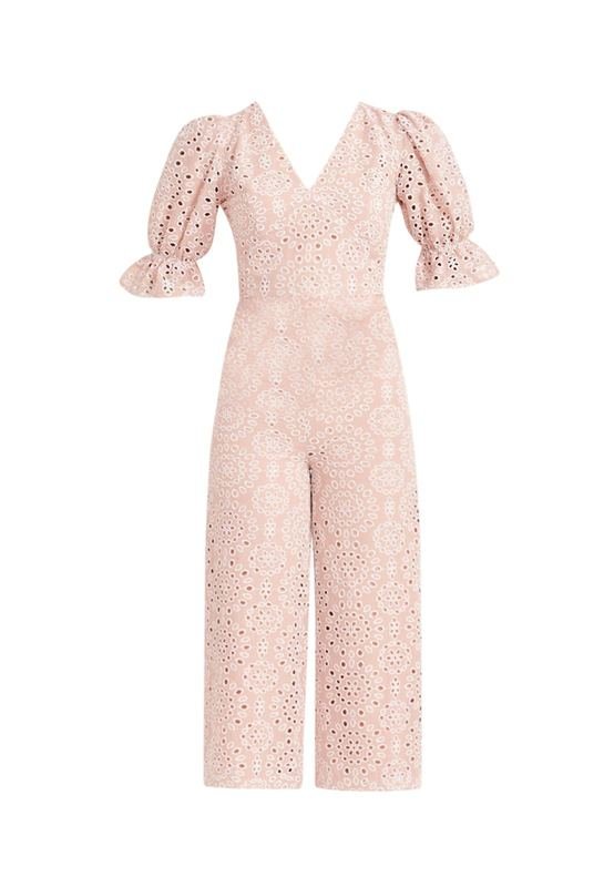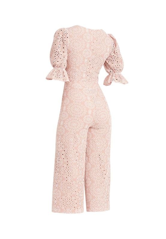 A modern ensemble crafted with an eyelet fabric in a trendy powder pink color. The pants have a fitted silhouette contrasted with wide hems.