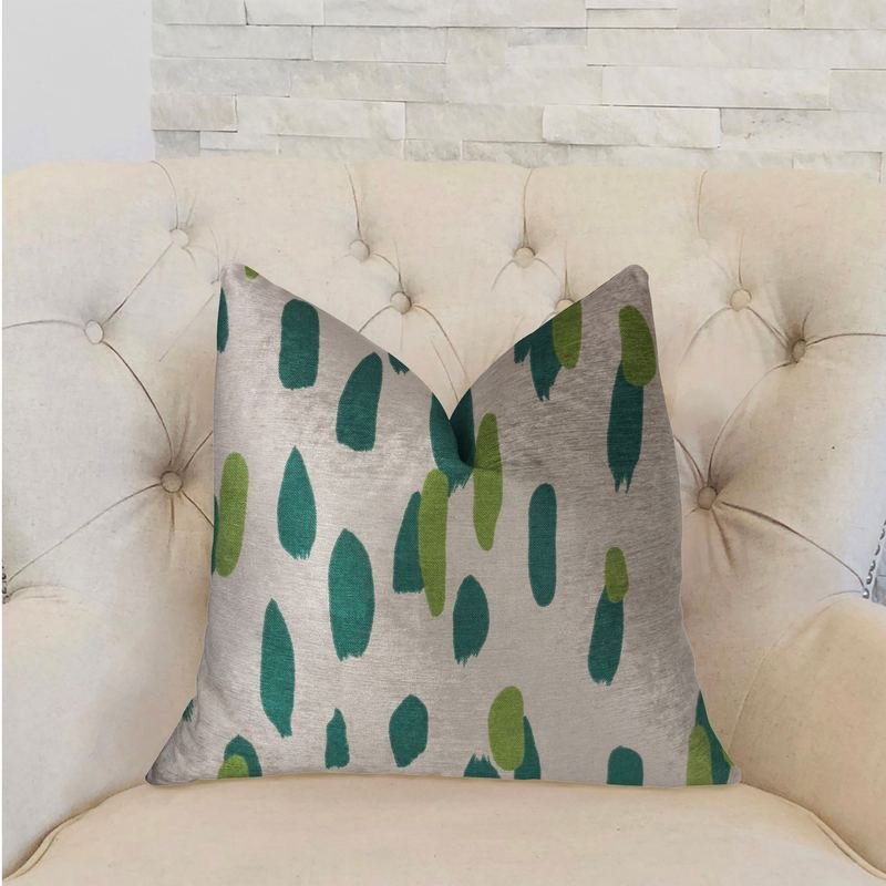 Change a feel of a room with this luxury posh and upscale designer throw pillow. Transform any space with this bold and ravishing look with this plutus bosky willow green and beige luxury throw pillow. The fabric of this luxury pillow is a blend of Cotton.*Colors: Green and Beige*Fabric Origin: United States. Pillows are Handmade in USA*Double Sided pillow*Invisible zipper enclosure for a tailored look*All seams are over-locked and stitched for a professional finish*Pattern placement may vary slightly*Pillow measurements are seam to seam from the inside*Pillows include *Made in USA* Hypoallergenic Down Alternative Polyfill Insert*Dry Clean recommended*Fabric Content: 100% Cotton*Pattern: Dot*Flammability: CAL 117-2013, NFPA 260, UFAC IIngredients: Hypoallergenic Down Alternative PolyfillSize: Double sided 16″ x 16″Color: Green and BeigeMade In: United States