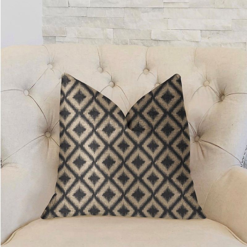 Add eloquence within any formal setting with this opulent design plutus diamond embers gray and beige luxury throw pillow. The fabric of this luxury pillow is a blend of Cotton and Polyester.*Colors: Gray and Beige*Fabric Origin: Turkey. Pillows are Handmade in USA*Double Sided pillow*Invisible zipper enclosure for a tailored look*All seams are over-locked and stitched for a professional finish*Pattern placement may vary slightly*Pillow measurements are seam to seam from the inside*Pillows include *Made in USA* Hypoallergenic Down Alternative Polyfill Insert*Dry Clean recommended*Fabric Content: 59% Cotton, 41% Polyester*Pattern: Ikat*Flammability: CAL 117-2013, NFPA 260, UFAC IIngredients: Hypoallergenic Down Alternative PolyfillSize: Double sided 20″ x 36″ KingColor: Gray and BeigeMade In: United States