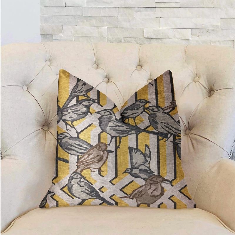 Make a bold visual statement in any space with this plutus song bird gardens yellow, beige and gray luxury throw pillow. The fabric of this luxury pillow is a blend of Cotton.*Colors: Yellow, Beige and Gray*Fabric Origin: United States. Pillows are Handmade in USA*Double Sided pillow*Invisible zipper enclosure for a tailored look*All seams are over-locked and stitched for a professional finish*Pattern placement may vary slightly*Pillow measurements are seam to seam from the inside*Pillows include *Made in USA* Hypoallergenic Down Alternative Polyfill Insert*Dry Clean recommended*Fabric Content: 100% Cotton*Pattern: Bird*Flammability: CAL 117-2013, NFPA 260, UFAC I Hypoallergenic Down Alternative Polyfill