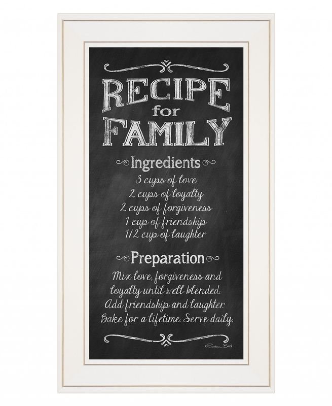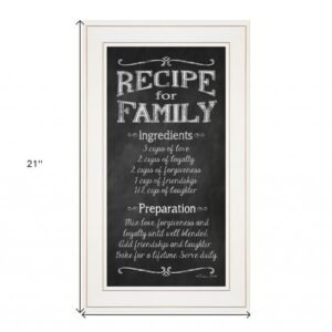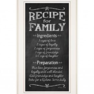 This recipe for family white framed print wall art will add a beautiful decorative accent to your decor. This print is a visual artistic expression that allows you to decorate your space in style. Reproduced for you on wood, this hanging decorative accent will be a trendy and fashionable way to dress your walls in a rustic and modern farmhouse vibe. Hang on your wall to add some up to date fashion and decoration. Instantly liven up your space with this art that brings color and dimension to your walls. 21-inch H x 12-inch W x 1-inch D