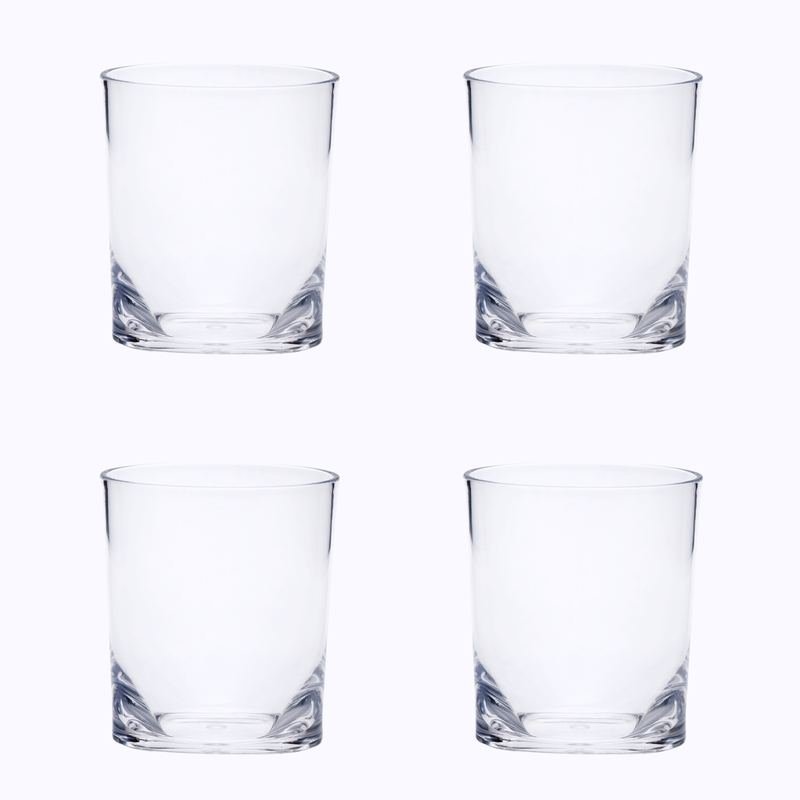 The set of four clear acrylic stemless whiskey glass is a good-looking glass to use for your favorite whiskey but can also be used for most any other drink or beverage. Whether you are entertaining or simply enjoying a drink by yourself, a quality set of stemware is a must-have. Add an air of casual elegance with the fresh and modern design of a stemless glass. The addition of a machine embossed design gives this glass special character and dimension. Add iconic style to your setting with this good looking no pattern and not solid color pattern. The smooth non-texture of this surface will feel elegant and sleek in your hand. Whatever your beverage preference, you are certain to enjoy the enhanced flavor and taste that comes with consuming from the proper vessel. 3.93-inch H x 3.5-inch W x 3.5-inch D