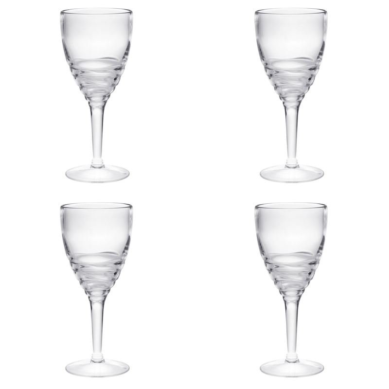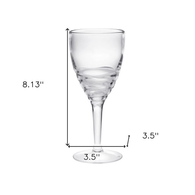 From first sip to last drop, you are certain to savor the taste of your favorite vino with the set of four clear swirl acrylic stemmed all purpose wine glass. Whether you are entertaining or simply enjoying a drink by yourself, a quality set of stemware is a must-have. Stemmed drinkware allows you to hold your drink without the heat of your hand impacting it?EUR(TM)s contents. The addition of a machine embossed design gives this glass special character and dimension. Bring a pop of personality to your kitchen or dining room with this swirl pattern. The texture on this surface not only looks great but feels cool in your hand. Whatever your beverage preference, you are certain to enjoy the enhanced flavor and taste that comes with consuming from the proper vessel. 8.13-inch H x 3.5-inch W x 3.5-inch DIngredients: Size: Color: Made In: Taiwan