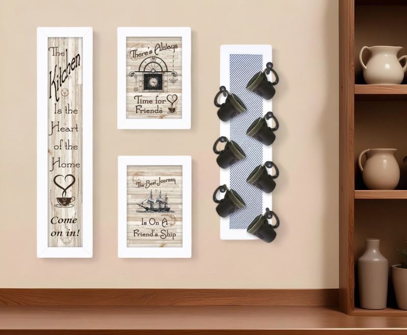 Set Of Four Kitchen Collection with Seven Peg Mug Rack White Framed Print Kitchen Wall Art