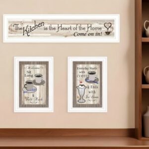 The set of three kitchen come in white framed print kitchen wall art is the perfect decorative accessory for your home. This print is a visual artistic expression that allows you to decorate your space in style. Reproduced for you on paper, this hanging decorative accent will be a trendy and fashionable way to dress your walls. Hang on your wall to add some up to date fashion and decoration. Instantly liven up your space with this art that brings color and dimension to your walls. 11-inch H x 33-inch W x 3-inch DIngredients: Size: Color: Made In: United States