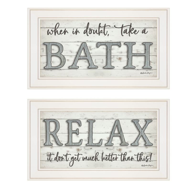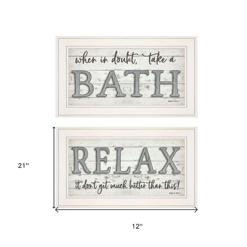 The set of two bath relax 1 white framed print bathroom wall art is the perfect decorative accessory for your home. This print is a visual artistic expression that allows you to decorate your space in style. Reproduced for you on paper, this hanging decorative accent will be a trendy and fashionable way to dress your walls. Adding this hanging wall art to your space to make your room feel more finished and attractive. Utilize this opportunity to create a focal point in the room with this fabulous wall decor option. 12-inch H x 21-inch W x 1-inch D