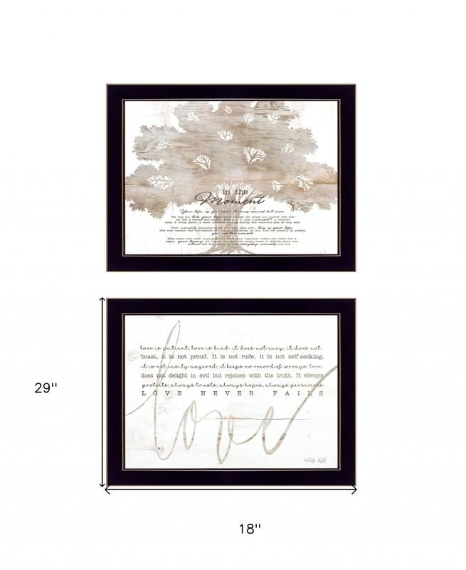 The set of two love or in the moment 2 black framed print wall art is the perfect decorative accessory for your home. This print is a visual artistic expression that allows you to decorate your space in style. Reproduced for you on wood, this hanging decorative accent will be a trendy and fashionable way to dress your walls in a rustic and modern farmhouse vibe. Adding this hanging wall art to your space to make your room feel more finished and attractive. Utilize this opportunity to create a focal point in the room with this fabulous wall decor option. 29-inch H x 18-inch W x 1-inch DIngredients: Size: Color: Made In: United States