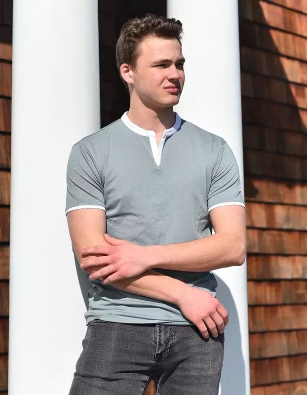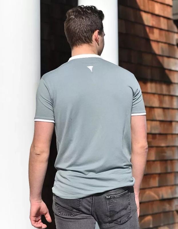Step-up your casual look in this super soft yet durable, stylish buttonless Henley in blue gray with white trim. A slightly tapered fit and clean, masculine lines help create a fit to perfectly accent the male form. This is not your typical t-shirt material, this is high-end, breathable, stretch fabric at an affordable priceyou’ll see and feel the difference!