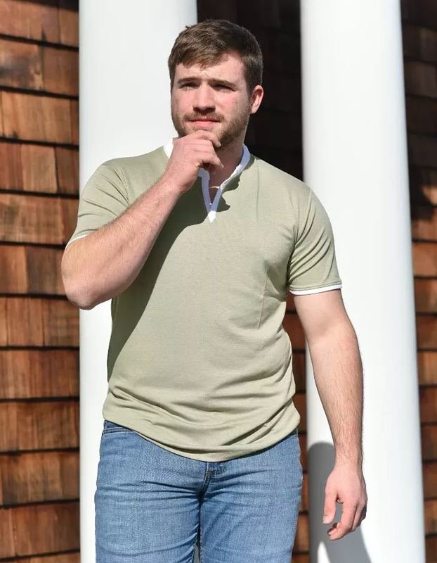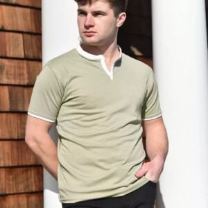 Step-up your casual look in this super soft yet durable, stylish buttonless Henley in taupe with white trim. A slightly tapered fit and clean, masculine lines help create a fit to perfectly accent the male form. This is not your typical t-shirt material, this is high-end, breathable, stretch fabric at an affordable priceyou’ll see and feel the difference!
