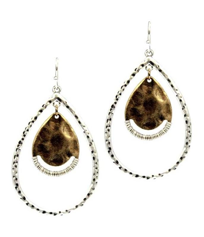 Silver teardrop shaped dangle earring with interior gold teardrop accent.