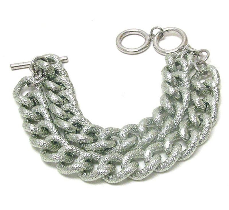 A textured silver double thick metal chain bracelet with a toggle clasp.