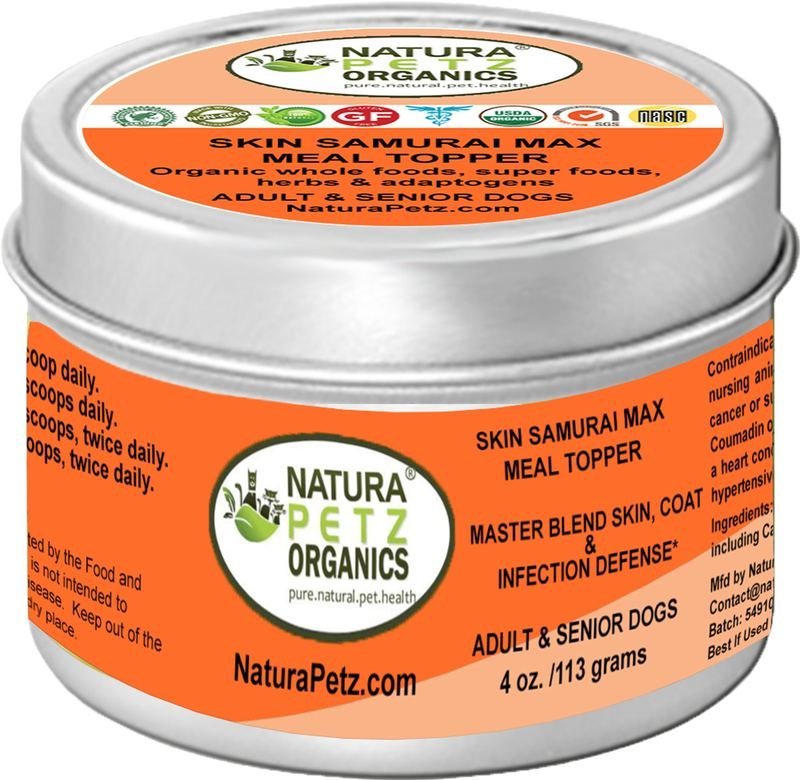 SKIN SAMURAI MAX* MEAL TOPPER may be an invaluable addition to a pet’s diet who suffers from idiopathic skin allergens and allergic atopic or contact dermatitis, as its plant actions moderate cellular inflammation that is triggered by excess mast and histamine response (allergen triggers) as its plant actions work to help block mast and histamine receptors.