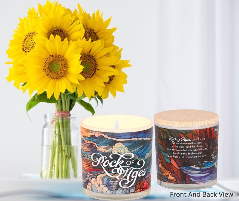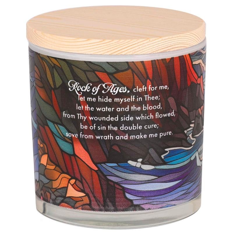This Lidded Candle Features A Beautiful Stained-Glass Design. Warm And Inviting, The Candle Is Lightly Scented With All Natural Soy Wax, Two Lead-Free Cotton Wicks, And Holds Approximately 50 Hours Of Burn Time. Soy Wax Is Non-Toxic And Cleaner-Burning Containing No Toxins, Carcinogens, Or Pollutants. Material: Soy Wax, Glass, Wood. Size: 13 Oz, 4In Diameter By 4 1/4 In High. Displays A Portion Of The Traditional Hymn: Rock Of Ages (Augustus Toplady, 1776). Comes Packed In A White Or Brown Box.