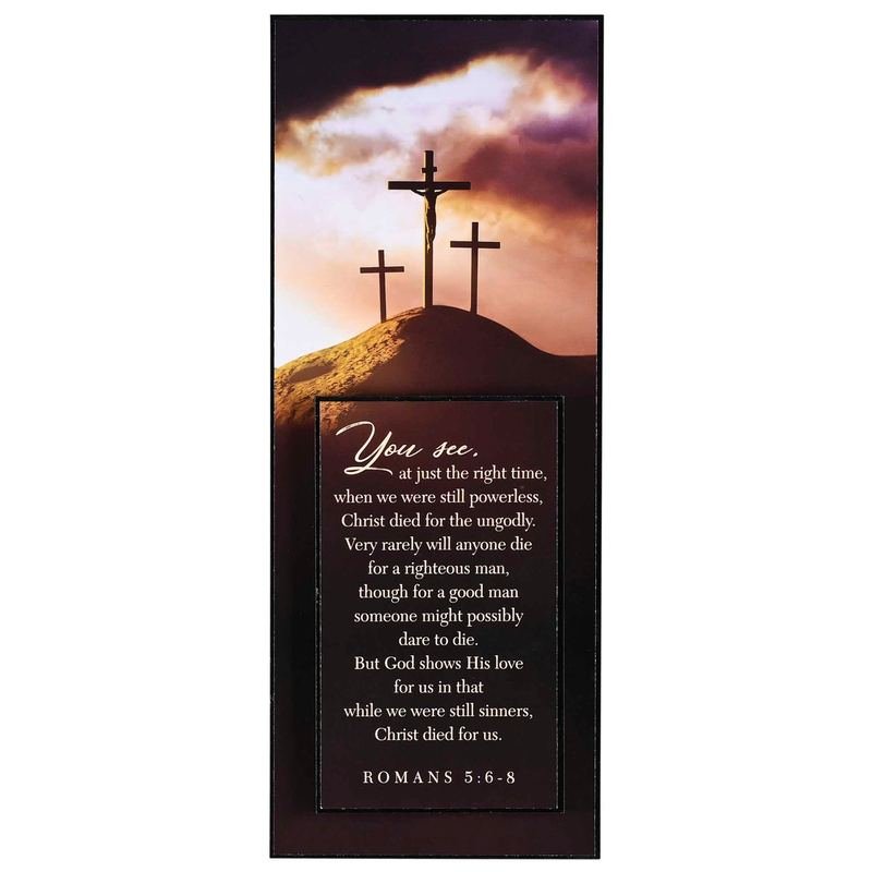 This Wall Plaque Is Actually Two Plaques In One. The Larger Background Layer Is 3/4In Thick And Features The 3 Crosses At Golgotha. The Second Plaque, 1/4In Thick, Is Layered Over The First. It Features Romans 5:6-8. Overall Plaque Size Is 4 x 10 x 1. Hanging Slot On Back. All Edges Finished In Black. Plaque Is MDF, A Wood Material With A Smooth Surface. Scripture: You See, At Just The Right Time, When We Were Still Powerless, Christ Died For The Ungodly. Very Rarely Will Anyone Die For A Righteous Man, Though For A Good Man Someone Might Possibly Dare To Die. But God Shows His Love For Us In That While We Were Still Sinners, Christ Died For Us.