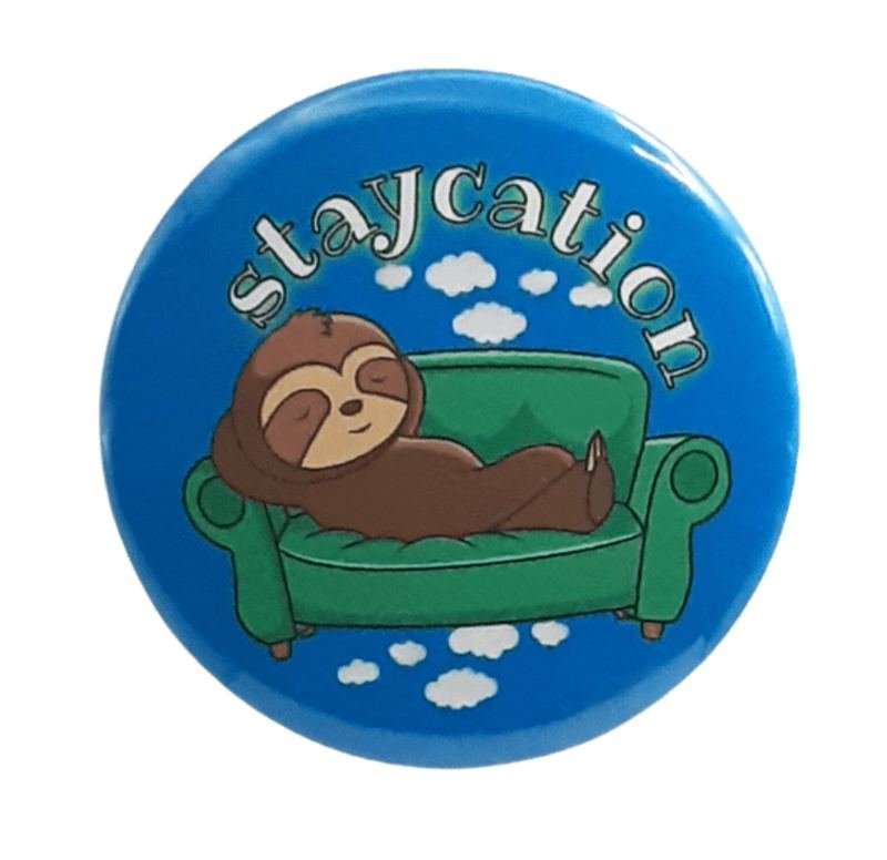 Staycation: A unique and stylish 2.25-inch pinback button, perfect for adding a touch of personality to your attire or accessories. Features a high-quality design and durable materials for long-lasting use. Ideal for collectors and enthusiasts.Ingredients: Size: 2.25 inchColor: Made In: United States