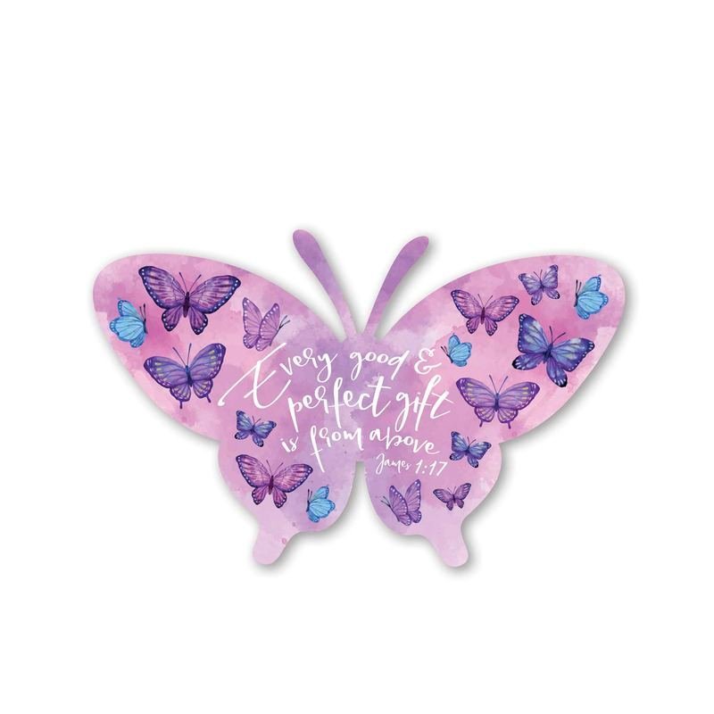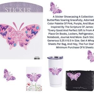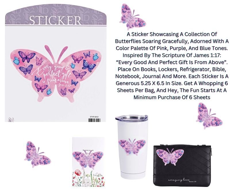 A Sticker Showcasing A Collection Of Butterflies Soaring Gracefully, Adorned With A Color Palette Of Pink, Purple, And Blue Tones. Inspired By The Scripture Of James 1:17: Every Good And Perfect Gift Is From Above. Place On Books, Lockers, Refrigerator, Bible, Notebook, Journal And More. Each Sticker Is A Generous 5.25 X 6.5 In Size. Get A Whopping 6 Sheets Per Bag, And Hey, The Fun Starts At A Minimum Purchase Of 6 Sheets.Ingredients: Size: Color: PNKMade In: United States