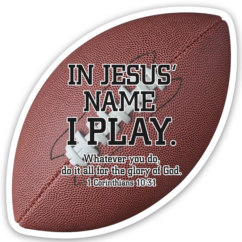 This Sticker Features A Football With Text And Scripture. Text: In Jesus Name I Play. 1 Corinthians 10:31: Whatever You Do, Do It All For The Glory Of God. Place On Books, Lockers, Refrigerator, Bible, Notebook, Journal And More. Each Sticker Is A Generous 5-1/4 X 6-1/2 In Size. Get A Whopping 6 Sheets Per Bag, And Hey, The Fun Starts At A Minimum Purchase Of 6 Sheets.Ingredients: Size: Color: MultiMade In: United States