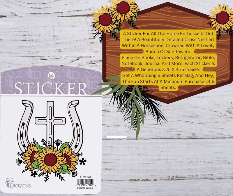A Sticker For All The Horse Enthusiasts Out There! A Beautifully Detailed Cross Nestled Within A Horseshoe, Crowned With A Lovely Bunch Of Sunflowers. Place On Books, Lockers, Refrigerator, Bible, Notebook, Journal And More. Each Sticker Is A Generous 3.75 X 4.75 In Size. Get A Whopping 6 Sheets Per Bag, And Hey, The Fun Starts At A Minimum Purchase Of 6 Sheets.