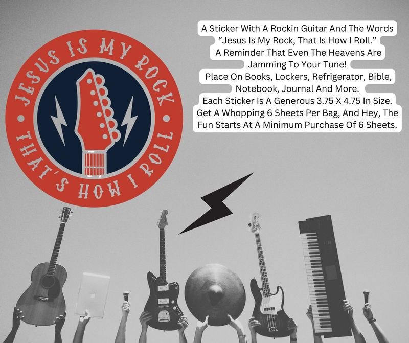 A Sticker With A Rockin Guitar And The Words Jesus Is My Rock, That Is How I Roll. A Reminder That Even The Heavens Are Jamming To Your Tune! Place On Books, Lockers, Refrigerator, Bible, Notebook, Journal And More. Each Sticker Is A Generous 3.75 X 4.75 In Size. Get A Whopping 6 Sheets Per Bag, And Hey, The Fun Starts At A Minimum Purchase Of 6 Sheets.