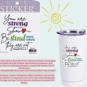 A Sticker Serving As A Reminder Of Our Internal Fortitude. Encouraging One To Exhibit Strength Of Mind, Demonstrate Compassion, And Kindness, Even In Challenging Situations. Inspired By Romans 15:5-6. Words Read: You Are Strong Minded, Show Heart, Be Kind Even When They Are Not. Place On Books, Lockers, Refrigerator, Bible, Notebook, Journal And More. Each Sticker Is A Generous 3.75 X 4.75 In Size. Get A Whopping 6 Sheets Per Bag, And Hey, The Fun Starts At A Minimum Purchase Of 6 Sheets.Ingredients: Size: Color: MULTIMade In: United States