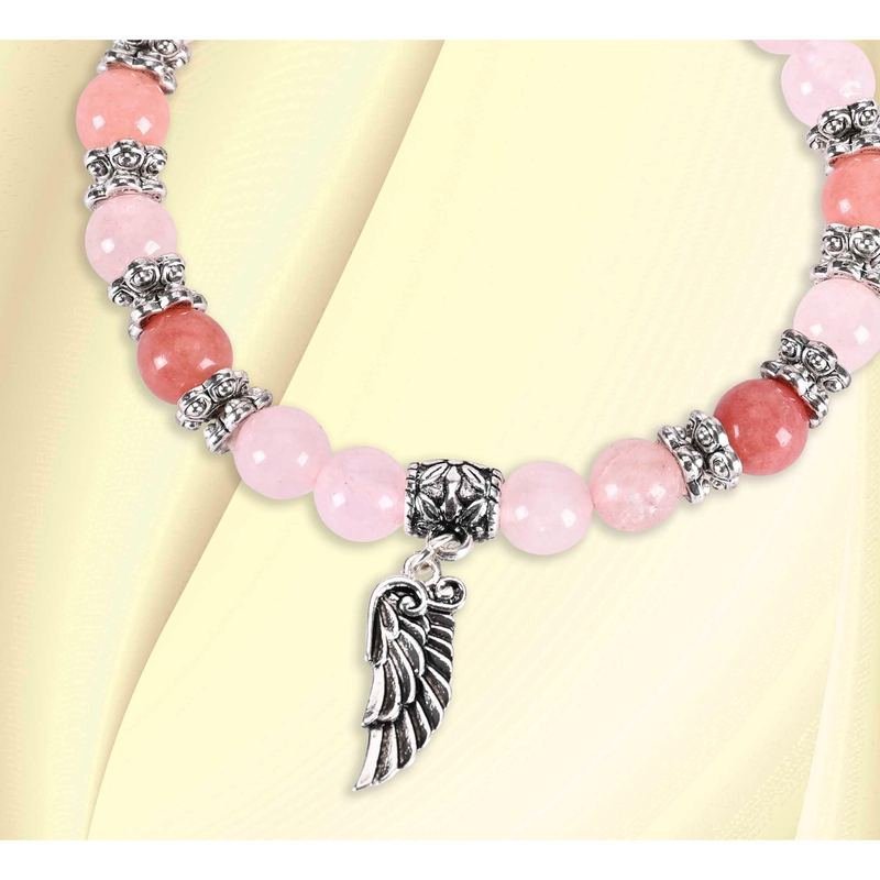 8mm Stones In Coral Tones Joined Together With Antiqued Silver Petal Spacers Form A Stretch Bracelet Measuring 2-1/2 In Diameter. Silver Plated Antiqued Angel Wing Is The Focal Point.