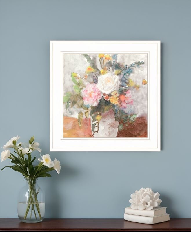 This table bouquet 2 white framed print wall art will add a beautiful decorative accent to your decor. This print is a visual artistic expression that allows you to decorate your space in style. Reproduced for you on wood, this hanging decorative accent will be a trendy and fashionable way to dress your walls in a rustic and modern farmhouse vibe. Adding this hanging wall art to your space to make your room feel more finished and attractive. Utilize this opportunity to create a focal point in the room with this fabulous wall decor option. 15-inch H x 15-inch W x 1-inch D