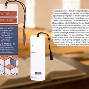 Tassel Bookmark – Thank You Faithful Servant. A Bookmark Featuring A Rustic Brown Tassel, Specifically Designed For A Faithful Servant That You Want To Recognize. These Bookmarks Are Crafted From Paper And Tassel Materials In A Black, Blue And Brown Color Scheme. Words Read: Thank You For Extending Grace And Mercy, For Following Gods Call, For Showing Christs Compassion In Deeds Both Big And Small. Your Ministry Is All Part Of Gods Sovereign, Perfect Plan: God Guides You, Loves You, Cares For You And Holds You In His Hand. To And From Spaces On The Back For You To Fill In For A Gift Giving Concept. Each Bookmark Measures 2 X 6 Comes In A Pack Of 12 Pieces, Minimum Buy Of 12 Piece Increments.Ingredients: Size: Color: MULTIMade In: United States