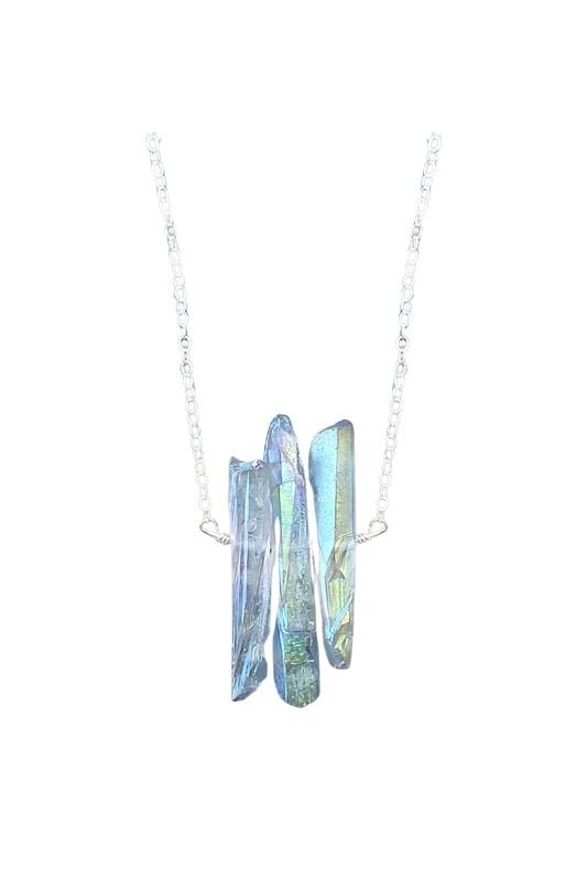Three Raw Mystic Grey Quartz Crystal Pendant Necklace in Silver.