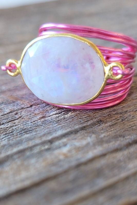 Available in hot pink over copper wire, with a 14k gold bezel set semi-precious gemstone. These rings will vary slightly due to the individual nature of the stones which are semi-precious and unique.