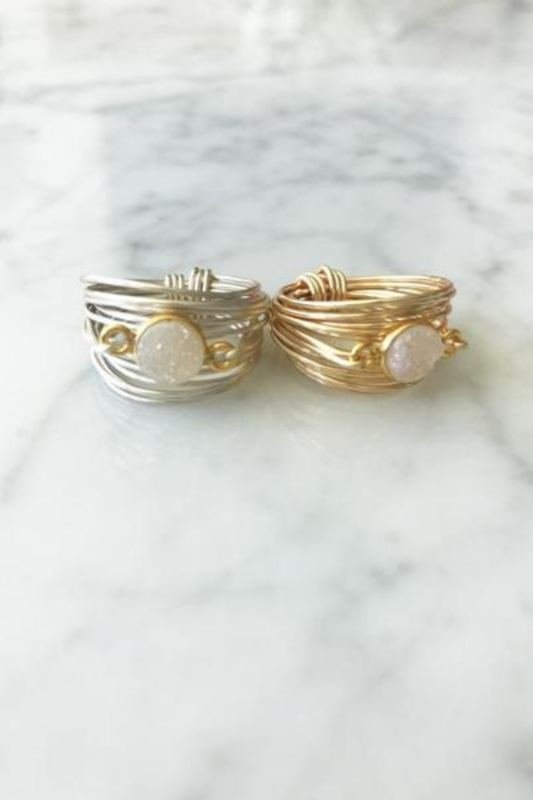 Available in your choice of wire, with a 14k gold bezel set semi-precious gemstone. These rings will vary slightly due to the individual nature of the stones which are semi-precious and unique.