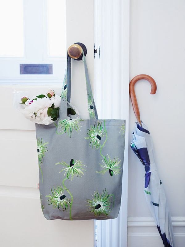 Cotton canvas tote in Green Thistle print. A summery alternative to a traditional purse. Measures 15.5″ x 14.5″ x 5″ with a 10.5″ handle. Design is identical on both front and back.