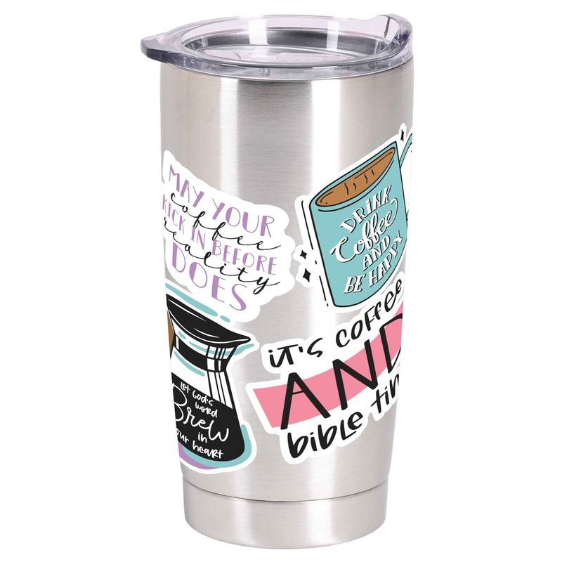 Tumbler Is 18/8 Stainless Steel Inside And Out; Finished In Silver On The Outside. Holds Up To 20 Ounces; Keeps Hot Drinks Hot And Cold Ones Cold For Hours. Clear Lid Includes Silicone Sealing Ring And A Sliding Mechanism To Easily Cover Or Uncover The Drink Opening. To Care For Tumbler, Hand Wash Only And Do Not Use In Microwave. Tumbler Features A Wrap-Around Design Of Our Coffee Collection Stickers; However, The Sticker Designs Are Actually Printed On The Tumbler.