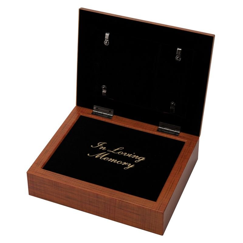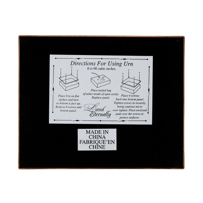 This Urn Box Is A Beautiful Resting Place For Ashes Of A Loved One. Finished On Outside In A Rich Walnut Wood Tone. Hinged Lid, With Ornate Rim, Is Also A Photo Frame. Comes With 7 x 5 Art Insert, Under Glass, With Words Of Comfort. Art Can Be Left In Place Or Easily Traded Out For A Personal Photo. Removable Back Behind Lid. When Opened, The Box Shows Black Panel Engraved In Gold With: In Loving Memory. Panel Is Not Removable. Bottom Of Box Can Be Unscrewed To Insert Bag Of Ashes; Instructions Are Attached. Capacity Is 90 Cubic Inches. Pads To Cover Screws Are Included Inside Box. Overall Box Size Is 9 5/8 x 7 3/4 x 2 1/2. Made Of A Super-Sturdy Polymer That Resists Cracking And Chipping. Print Features Revelation 21:4: He Will Wipe Away Every Tear From Their Eyes And Death Shall Be No More. There Will No Longer Be Any Mourning, Crying Or Pain, For The Old Order Of Things Has Passed Away.