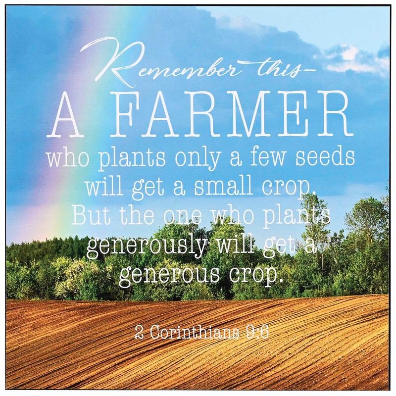 Wall Plaque Is 12 x 12 x 3/4; Sides Are Finished In Black. Hanging Slot In Back. Made Of MDF Wood. Depicted: A Farm/Rainbow Scene With 2 Corinthians 9:6: Remember This – A Farmer Who Plants Only A Few Seeds Will Get A Small Crop. But The One Who Plants Generously Will Get A Generous Crop.