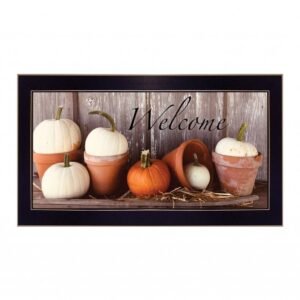Add an air of fashion to your room and rejuvenate the space with this welcome pumpkin shelf 3 black framed print wall art. This print is a visual artistic expression that allows you to decorate your space in style. Reproduced for you on paper, this hanging decorative accent will be a trendy and fashionable way to dress your walls. Hang on your wall to add some up to date fashion and decoration. Instantly liven up your space with this art that brings color and dimension to your walls. 11-inch H x 20-inch W x 1-inch DIngredients: Size: Color: Made In: United States